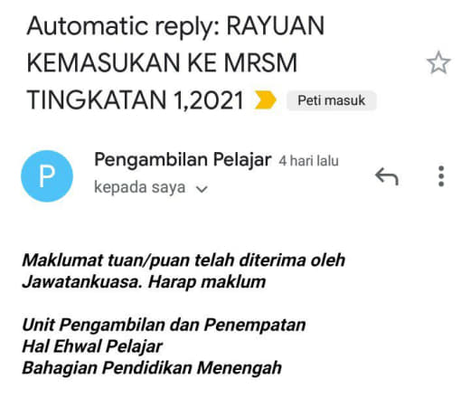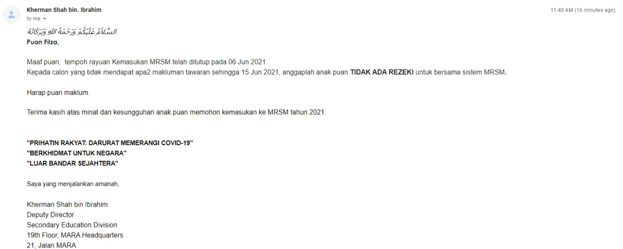 1. Mara dah buat kenyataan mereka yg berstatus rayuan dan masih gagal dapat tempat di Mrsm selepas 15/6/2021 boleh la menganggap rayuan mereka semua tu tidak berjaya..