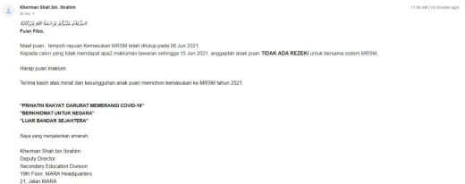 2. Oleh yg demikian, mereka yg berstatus Rayuan Anda Telah Diterima Dan Sedang Diproses tu boleh la cuba buat Surat Rayuan Mrsm ke Mara selepas 15/6/2021.