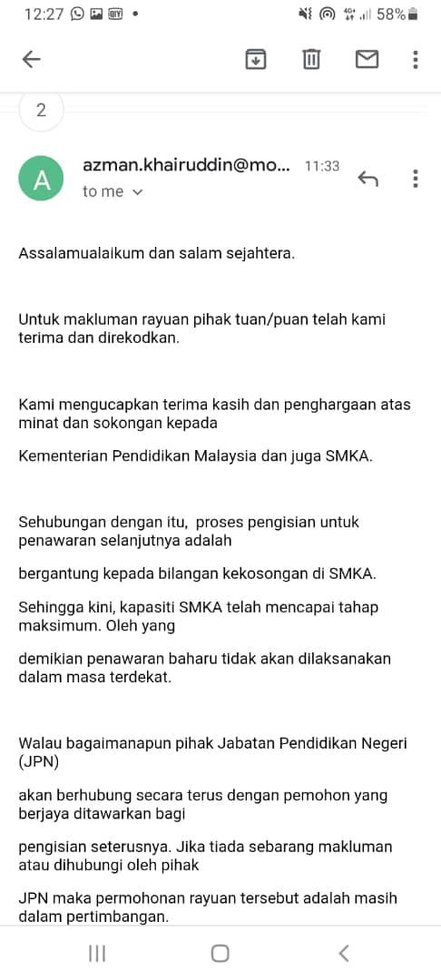 Seeloknya ke JPN sebab pengetua pasti akan kata Smka mereka dah penuh.