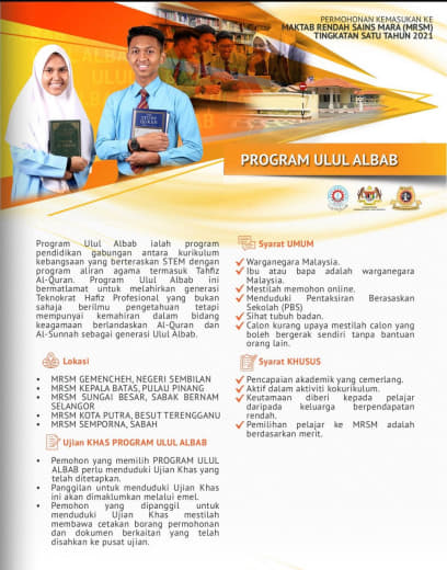 Ada jgk berbincang dgn anak anak sememangnya berminat utk apply maktab tentera diraja form 4 akan tetapi ada kemusyikilan saya jika ada rezeki di UA adakah bermasalah utk cebur diri dlm ketenteraan atas apa yg saya tahu Mrsm UA harus hbiskan 5 thn di sana...Jika di Mrsm primier boleh cuba mohon maktab tentera apabila melangkah masuk form 4...Dan adakah lepasi spm dr ulul albab jugak masih boleh mohon maktab tentera....Itu yg saya krg faham harap boleh bantu.....