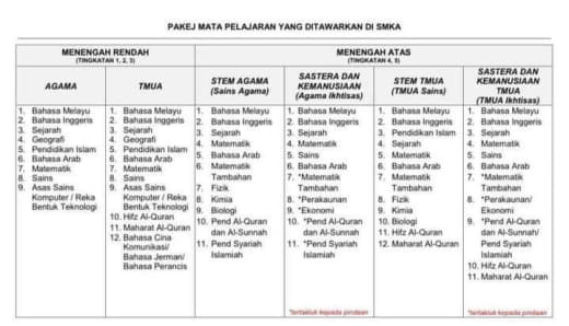 SMKA/KAA di SMK/SBPI/MRSM UA : list subjek dalam sijil PT3 Batch KSSM)