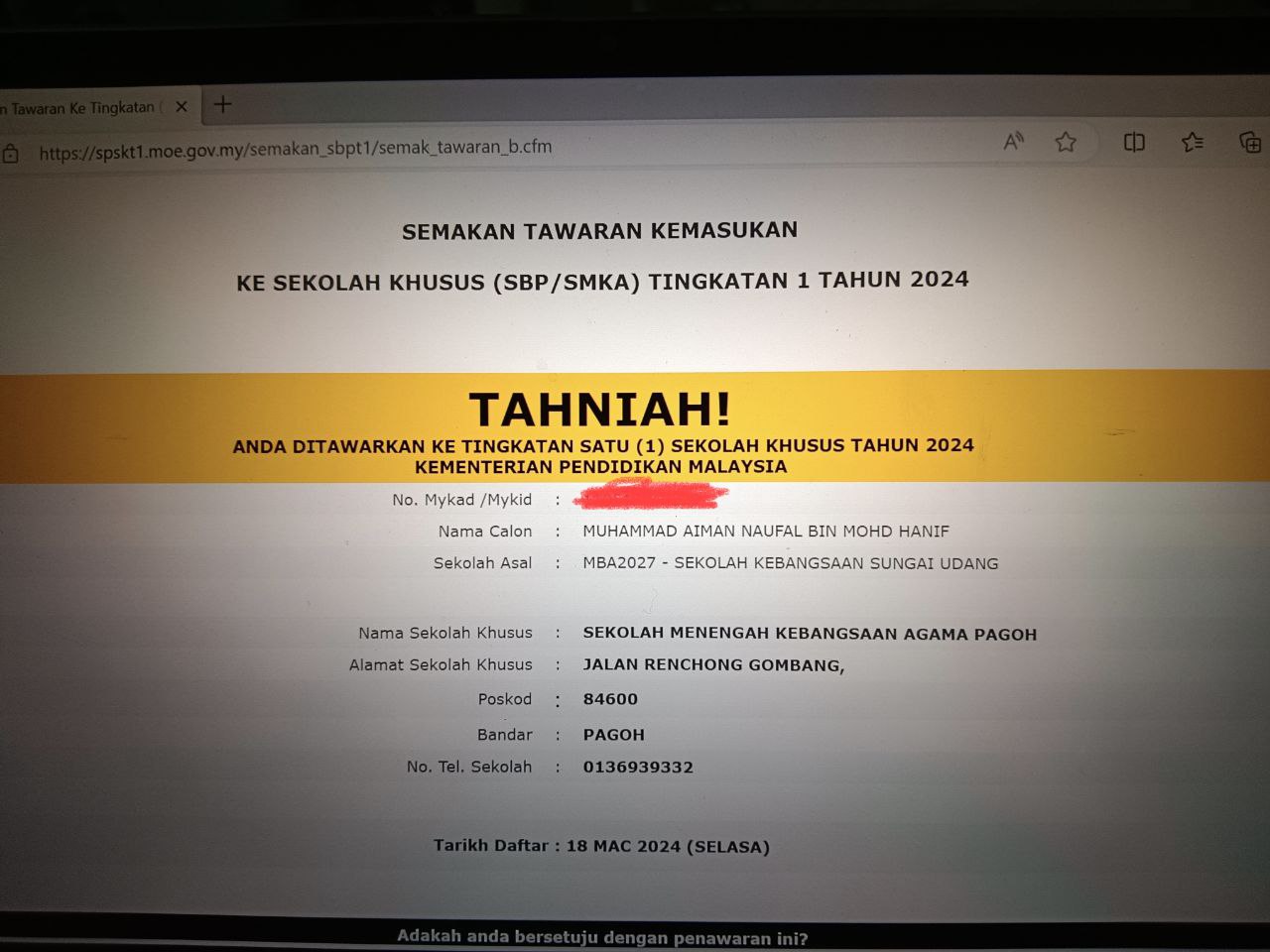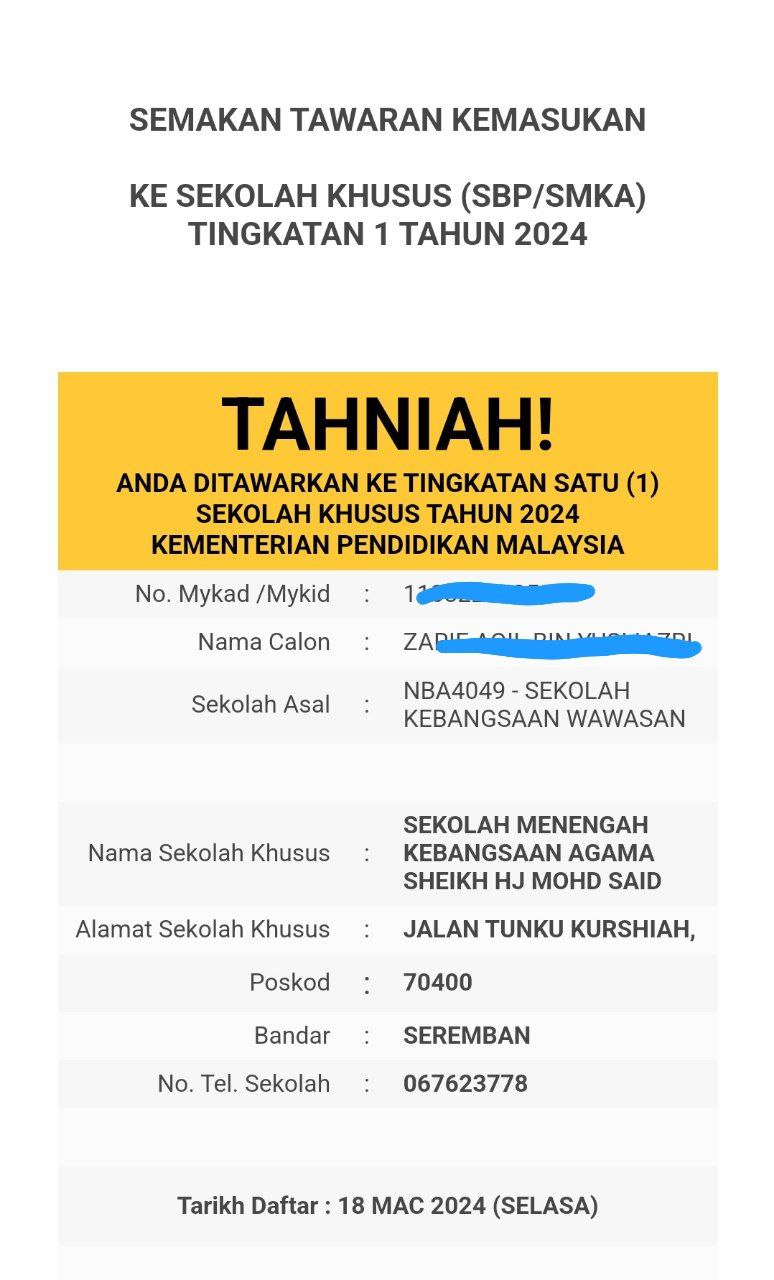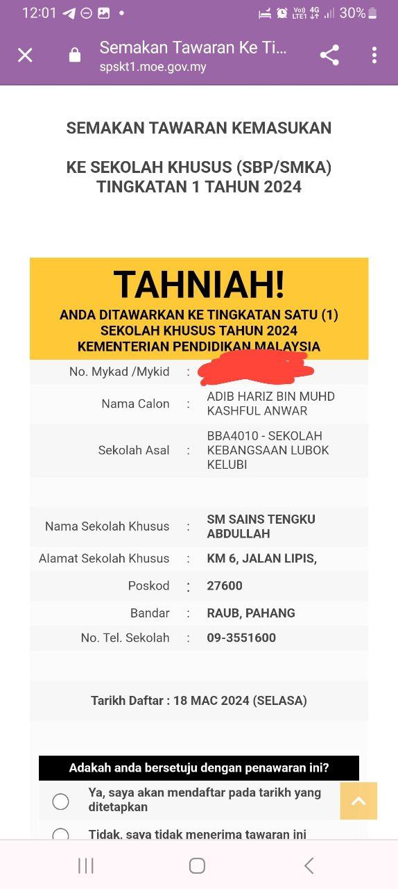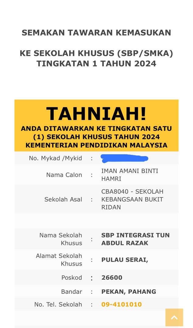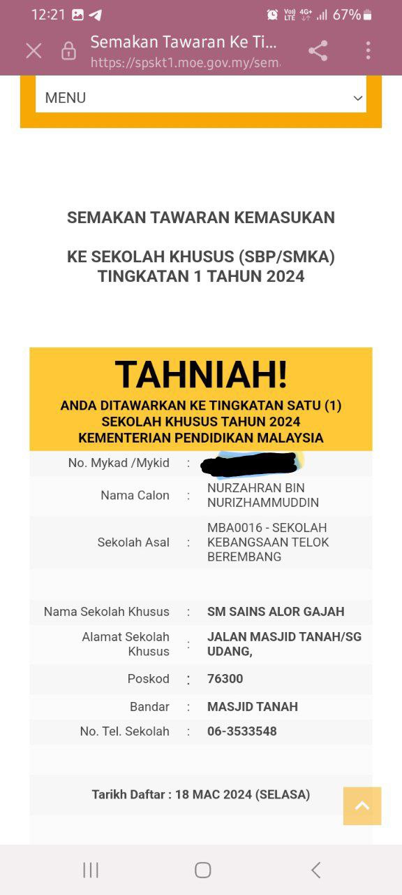 Alhamdulillah..ank sulung bujang sy Berjaya pilihan pertama dia..tksih byak2 Tn.hashim & parents2 dlm grp ni yg begitu byak share tips2 & pengalaman ank2 mereka..
