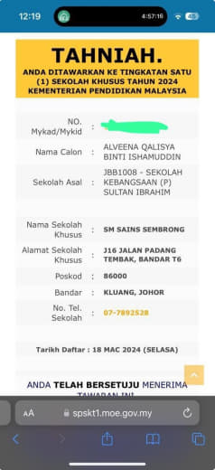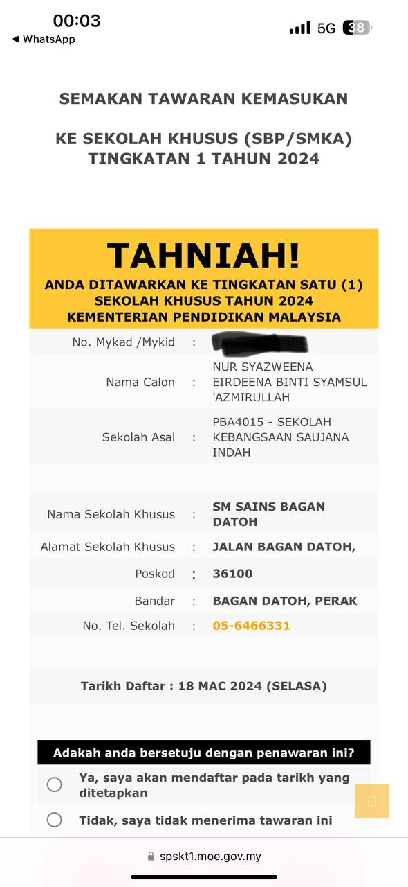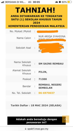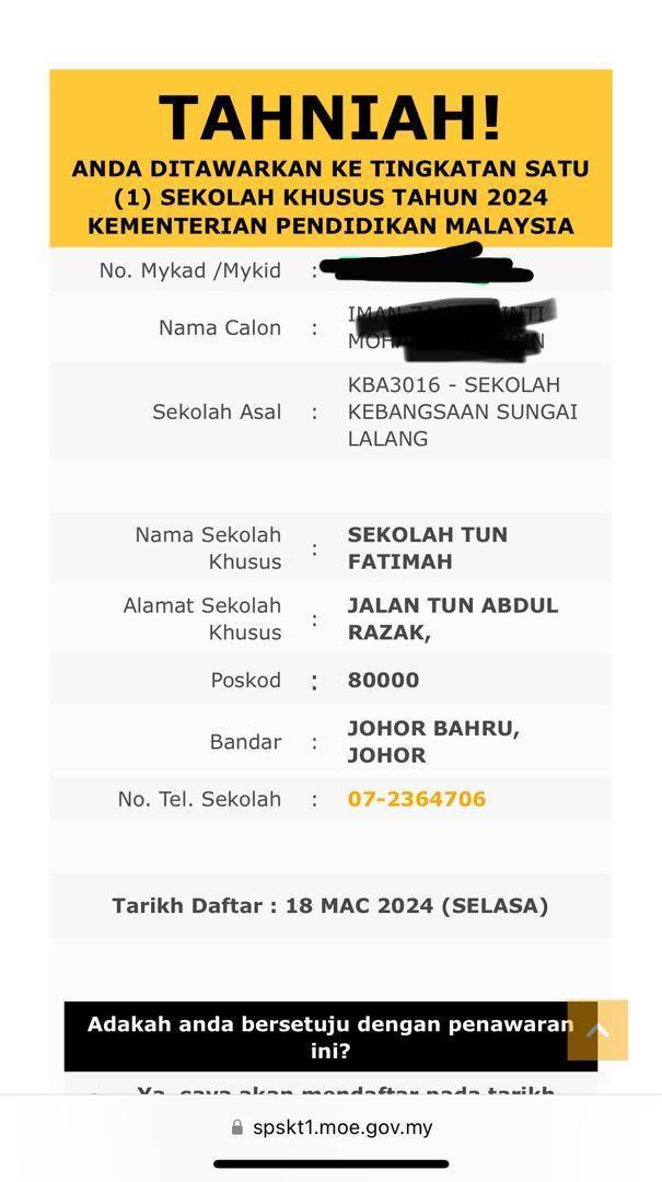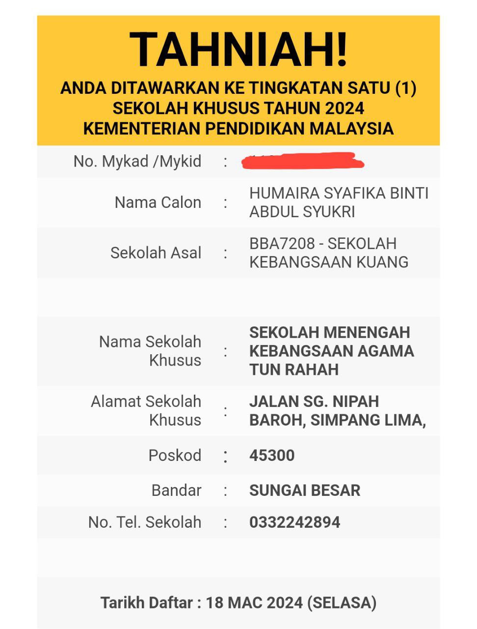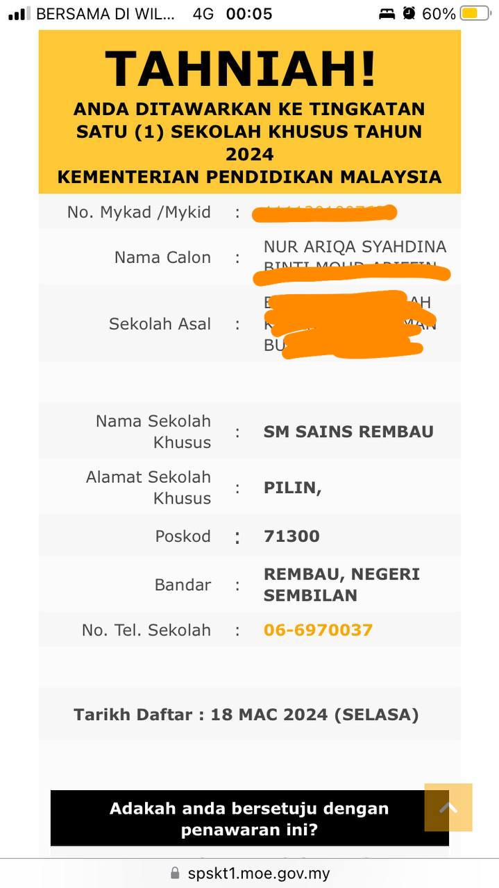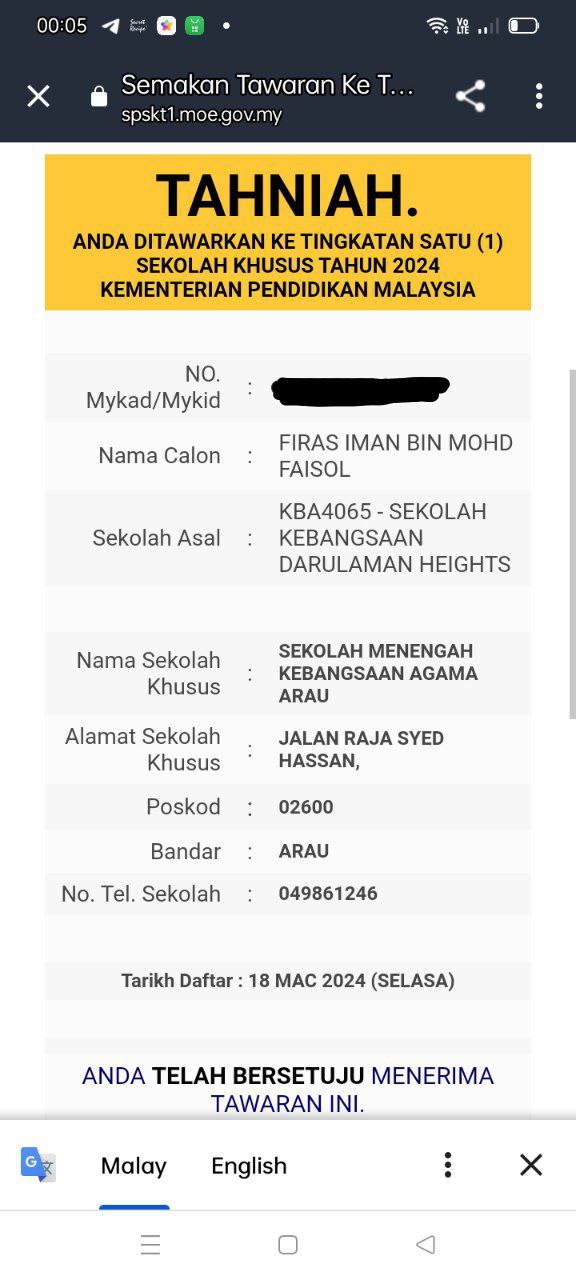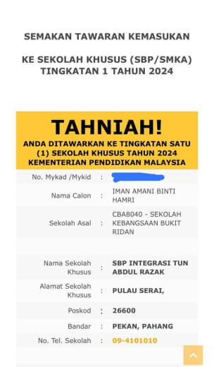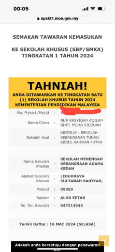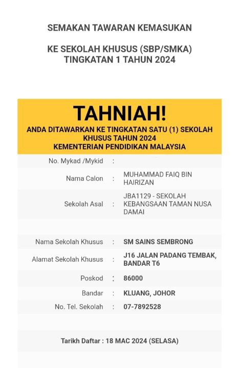 Alhamdulillahβ¦ Dpt pilihan pertama.. 10 min je dari rumah.. Jadinya akan melepaskn mrsm mersing.. Semoga ada rezeki anak2 yg lain utk masuk mrsm.. Terima kasih TH atas tunjuk ajarnya.. βΊοΈβΊοΈ