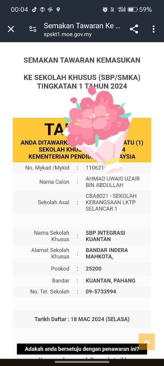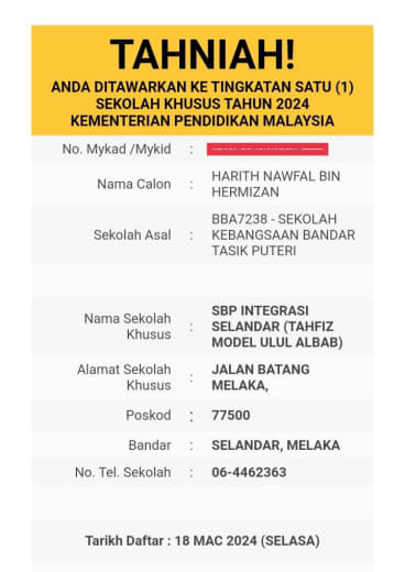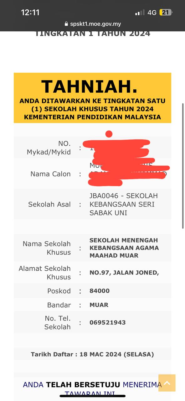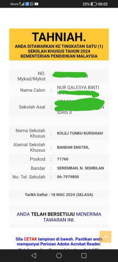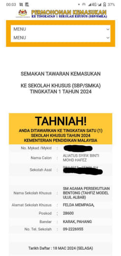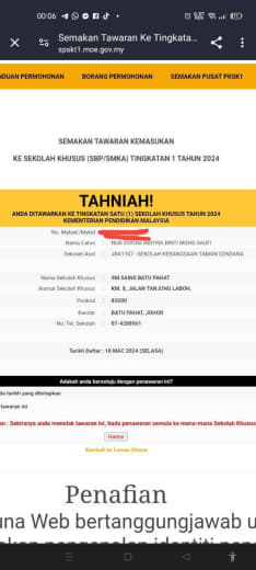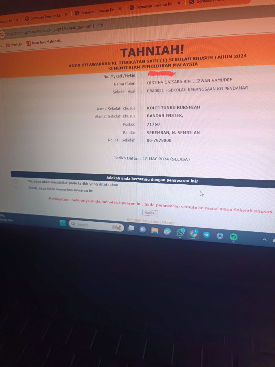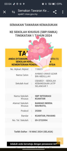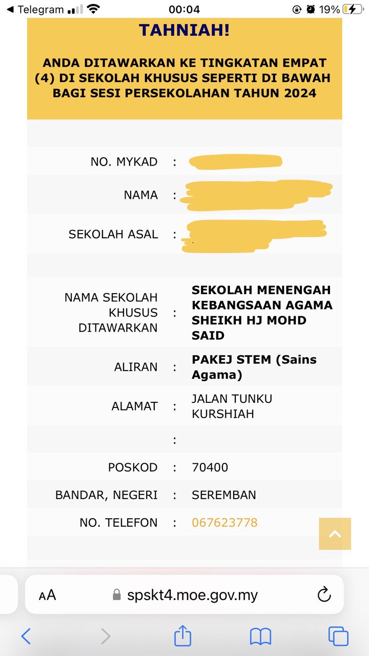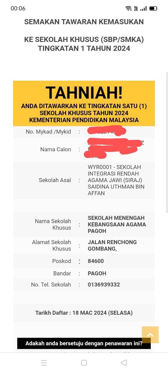 Alhamdulillahβ¦ Dpt pilihan pertama.. 10 min je dari rumah.. Jadinya akan melepaskn mrsm mersing.. Semoga ada rezeki anak2 yg lain utk masuk mrsm.. Terima kasih TH atas tunjuk ajarnya.. βΊοΈβΊοΈ