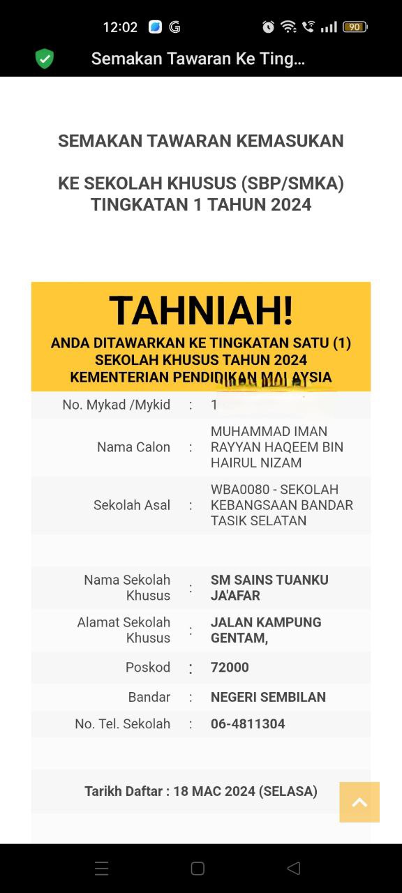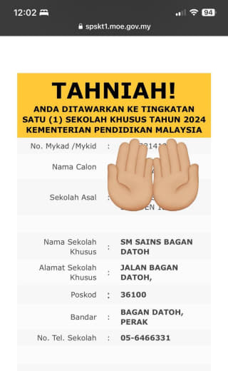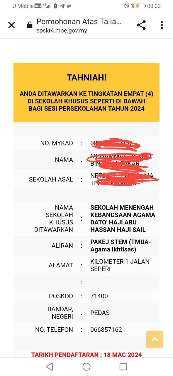Terima kasih TH, anak saya dapat pilihan pertama.. tak sangka langsung dapat sebab MRSM waiting list.. saya siap dah register bengkel untuk rayuan sabtu ni π€