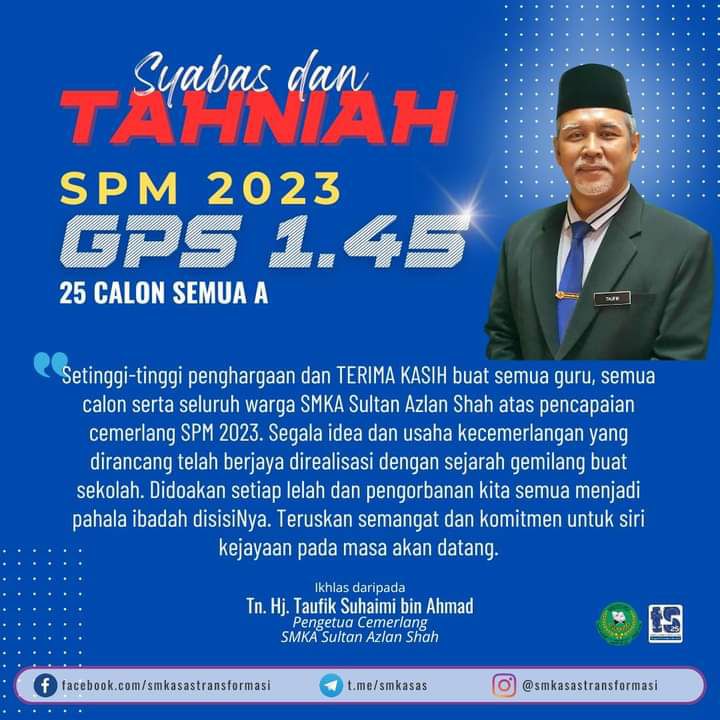 Sebagai kesimpulan, kejayaan SAS sebagai SBP nombor satu di Malaysia dalam SPM 2023 adalah nikmat besar dari Allah yang perlu disyukuri dengan penuh kesedaran. Saya ingin menekankan pentingnya kita sesri dan akui “peranan” Allah dalam setiap kejayaan. Kita juga perlu mengiktiraf usaha kolektif murid, guru, dan seluruh warga sekolah. Kejayaan ini juga adalah ujian untuk melihat sama ada kita bersyukur atau kufur dengan nikmat yang diberikan. Ambillah pengajaran dari kisah dalam Al-Quran yang mengingatkan kita tentang bahaya kesombongan dan pentingnya kerendahan hati. Usaha manusia adalah "sabab", tetapi hanya dengan izin Allah, usaha tersebut membawa hasil, mengingatkan kita untuk selalu bersyukur dan tidak terpedaya dengan nikmat yang diterima.