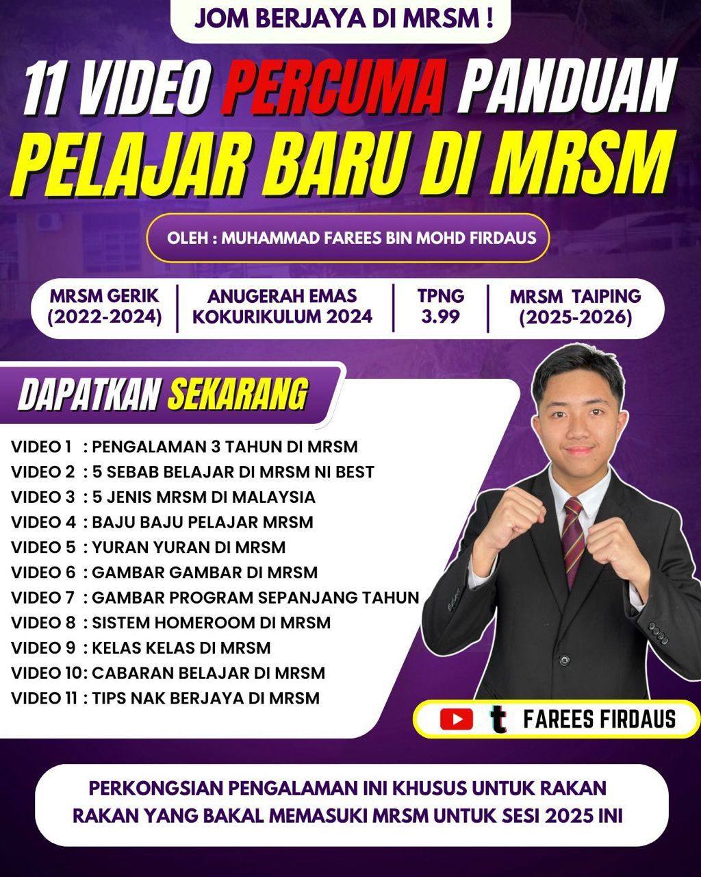Saya ada buat 11 Video Panduan Asas Pelajar Baru di MRSM.