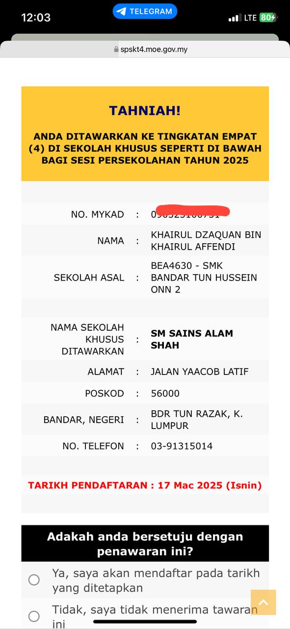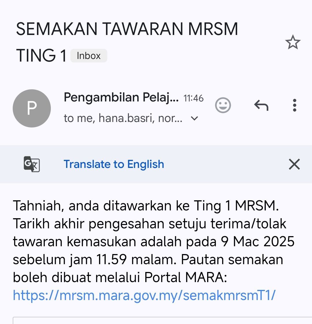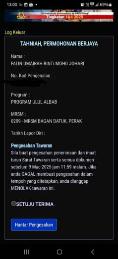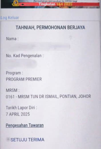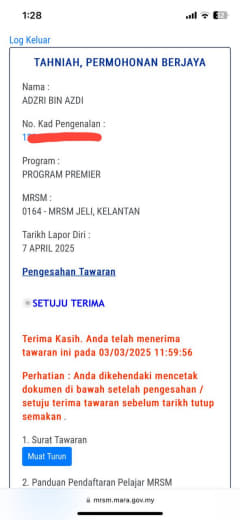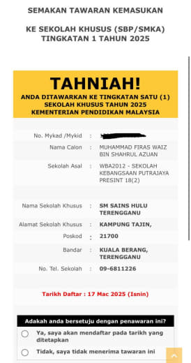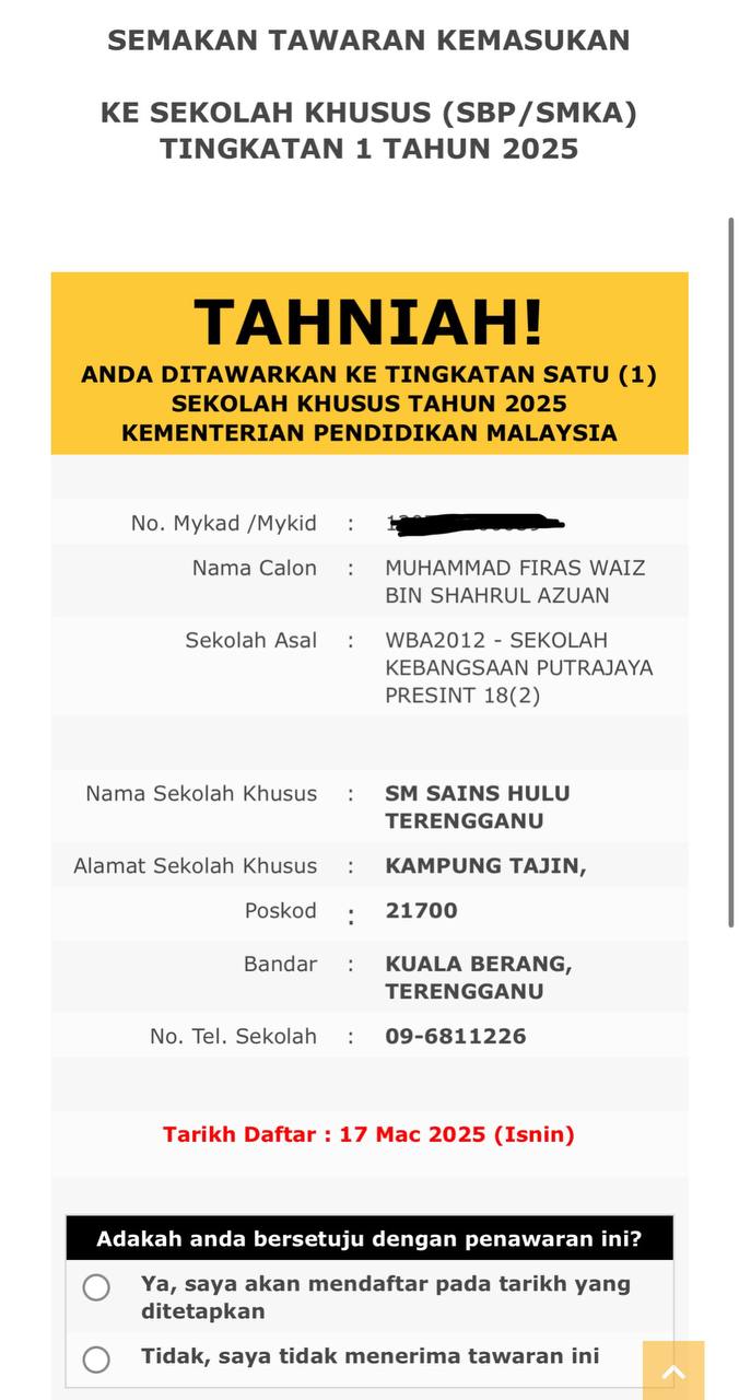 Salam TH.. Alhamdulillah..anak girl F1 dari shah alam dpt tawaran MRSM Kuala Berang hri ni..terima kasih byk TH.