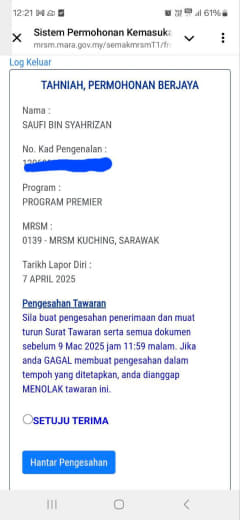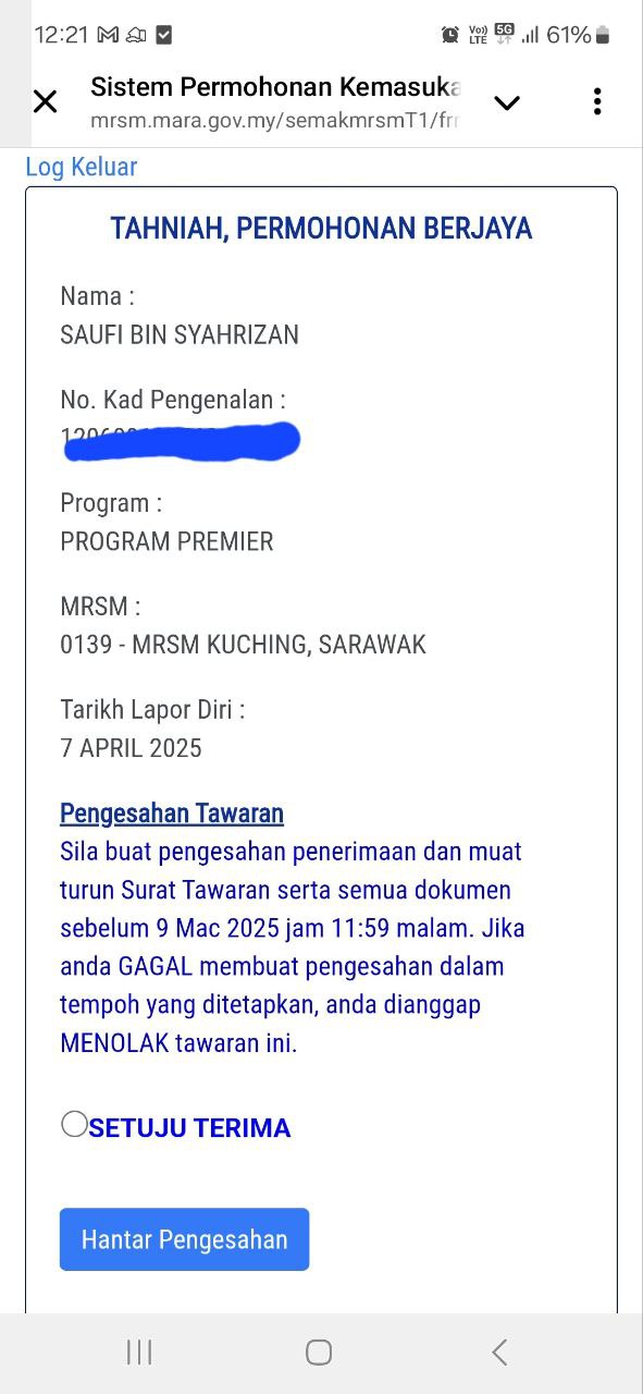 Alhamdulillah anak dpt MRSM Kuching...tp tu lah lama sgt kena sidai ngan MARA sbb anak pun dah pergi SBP Sains Kuching...rasanya tolak mrsm sbb dah berhabis duit nak masuk sbp haritu