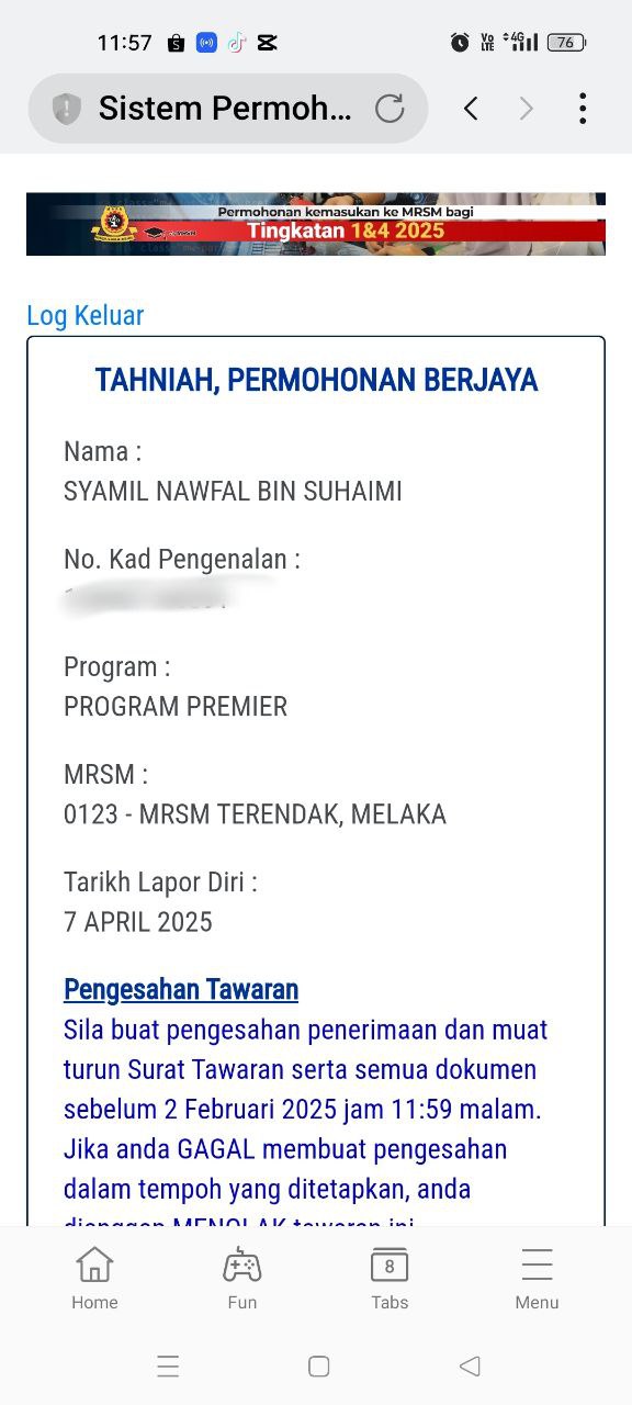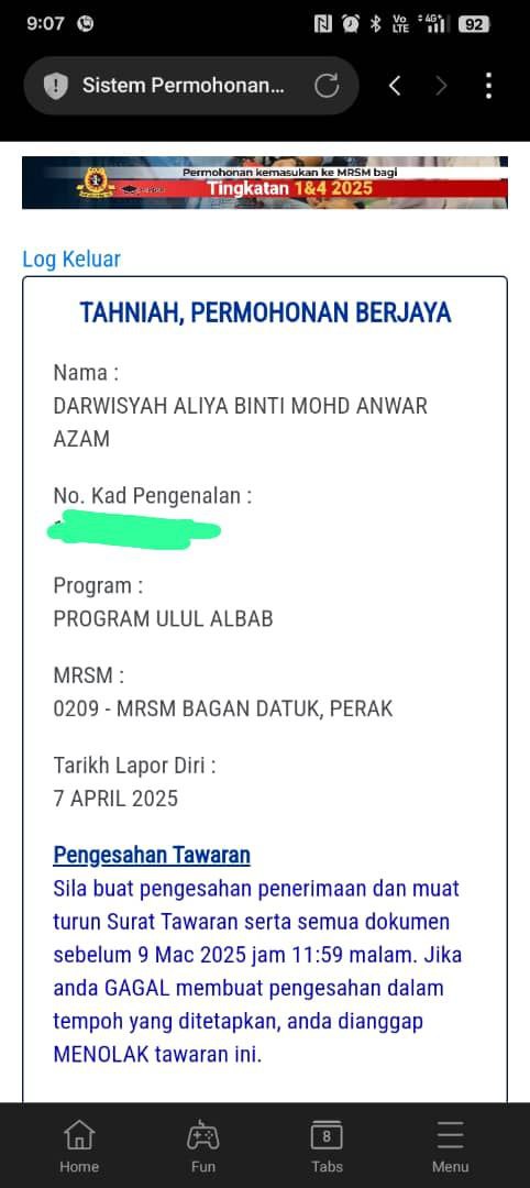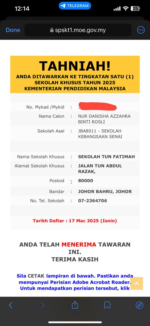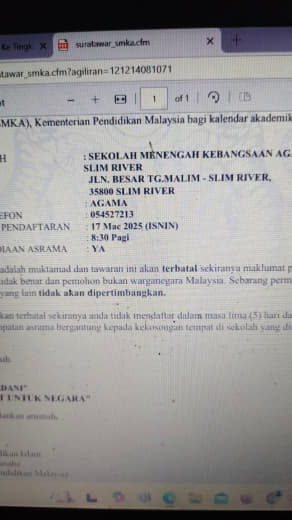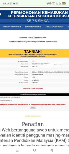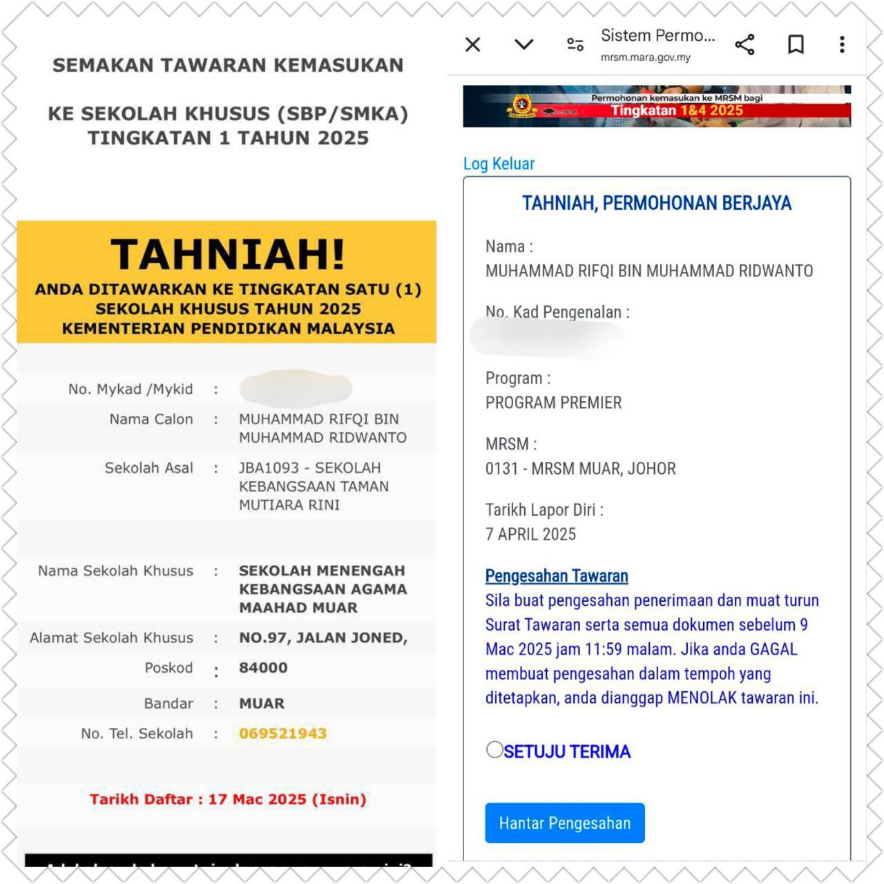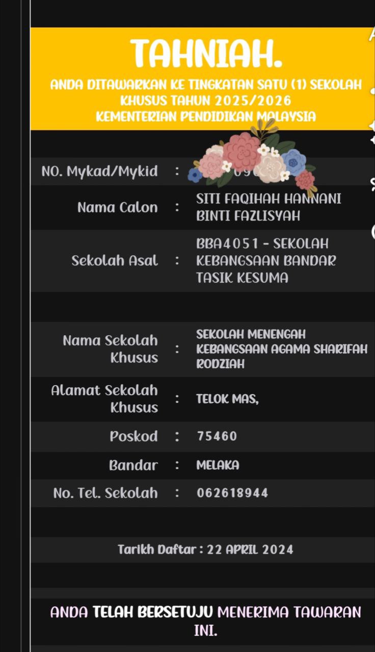Alhamdulillah syukur ya Allah anak sy di Idrisiah yang haritu melepaskan tawaran ke SABDA dapat ke MABDA hari ini.. Smlm check masih lg WL. Bila tgk ada yang dpt tawaran harini setelah WL smlm, terus saya check jugak walaupun hati tak mengharap. Alhamdulillah syukur ya Allah atas rezeki di bulan Ramadhan ini.. 😊 Insya Allah anak akan ke MABDA 😊