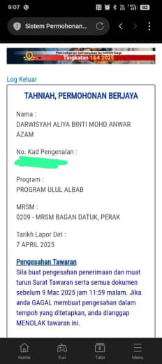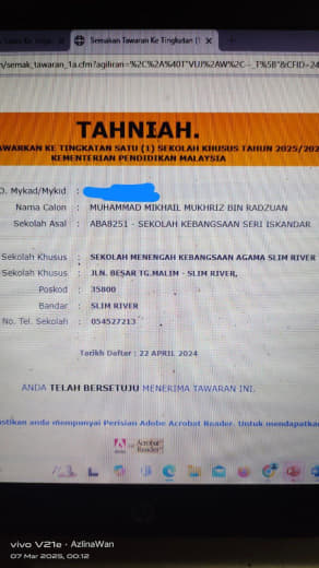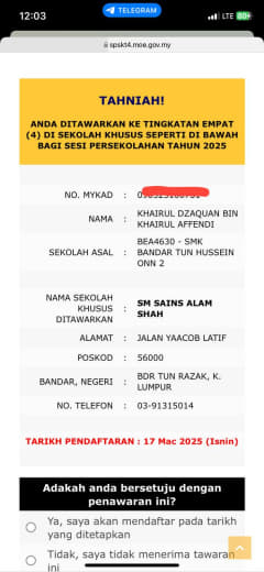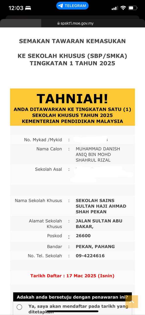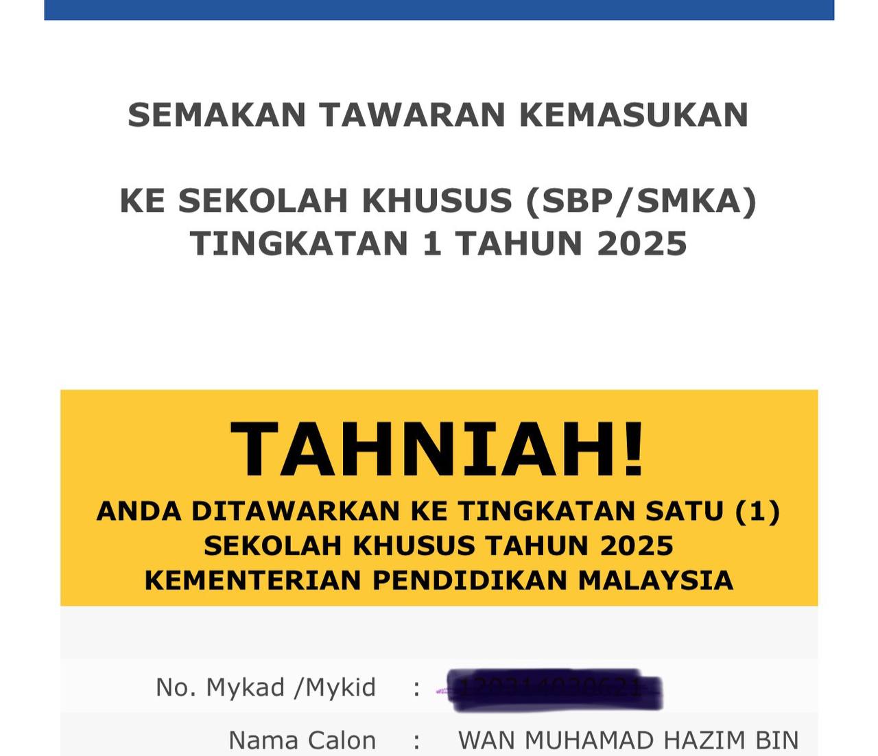 Alhamdulillah syukur. Rezeki utk anak sy diterima masuk ke SMKA Sultan Azlan Shah. Terima kasih tuan Hashim atas segala nasihat dan terima kasih doa dr semua ibu bapa dlm group ni. Alhamdulillah syukur.