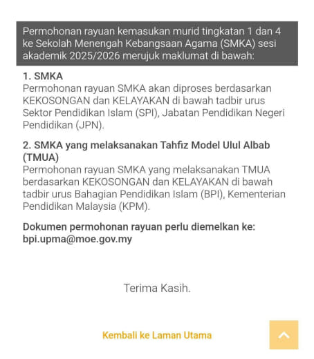 Kawan2, saya rasa bawah ni just nak maklumkan utk SMKA rayuan hantar ke SPI, JPN. Dan SMKA TMUA hantar ke BPI, KPM utk rayuan intake ke-3 nnt. Betul tak, Tuan Hashim ?