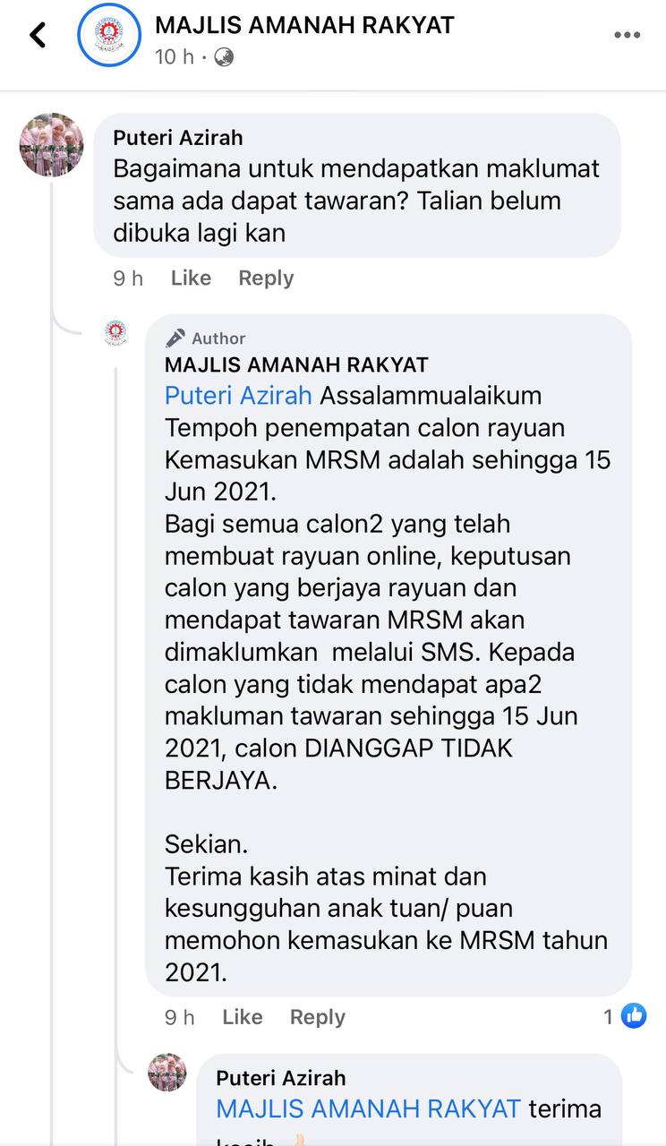 Saya pun buat rayuan juga puan, ada rezeki anak saya, dapat mrsm 2nd intake