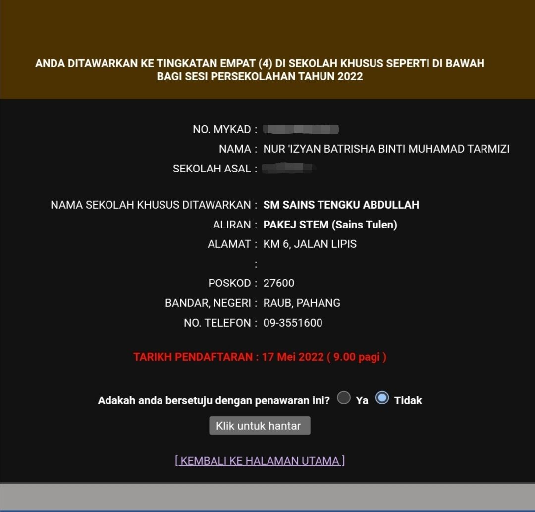 Jadi bagi semua yg inginkan tempat di MRSM harap dapat bersabar sedikit lagi je.