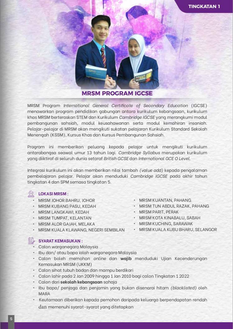 Tahun2021, ada pelajar thn 6 sek anak saya (sek integrasi islam swasta) yg dpt ke mrsm igcse di kelantan. Taapi bkn first intake. 2nd intake jika x silap saya