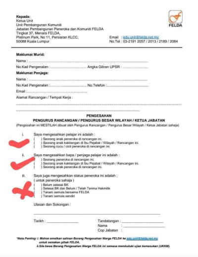 assalamualaikum.,saya apply ank saya dbwh kategori felda..permohonan pun dh submit...setahu saya sekiranya dbwh kategori felda.akan ada 1 borang untuk dtanda tangani pengurus felda.....mcm mn nk dpt borang tersebut ye...saya tgk dlm panduan tak da borang tersebut....adakah nnt pihak mara akan emailkn borang tersebut....