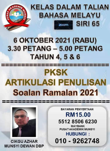 Ini soalan artikulasi penulisan tahun lepas...1 ari ada 3sesi pksk..ada 3soalan pilihan, pilih 1 tajuk penulisan.. utk setiap sesi berubah² soalan ..tpi so far soalan nmpk berulang..