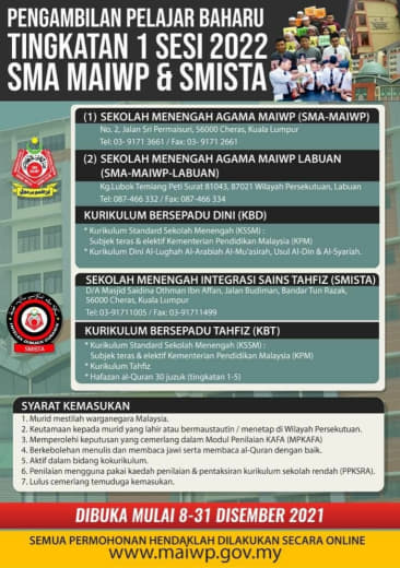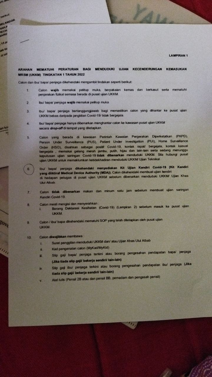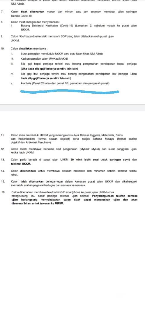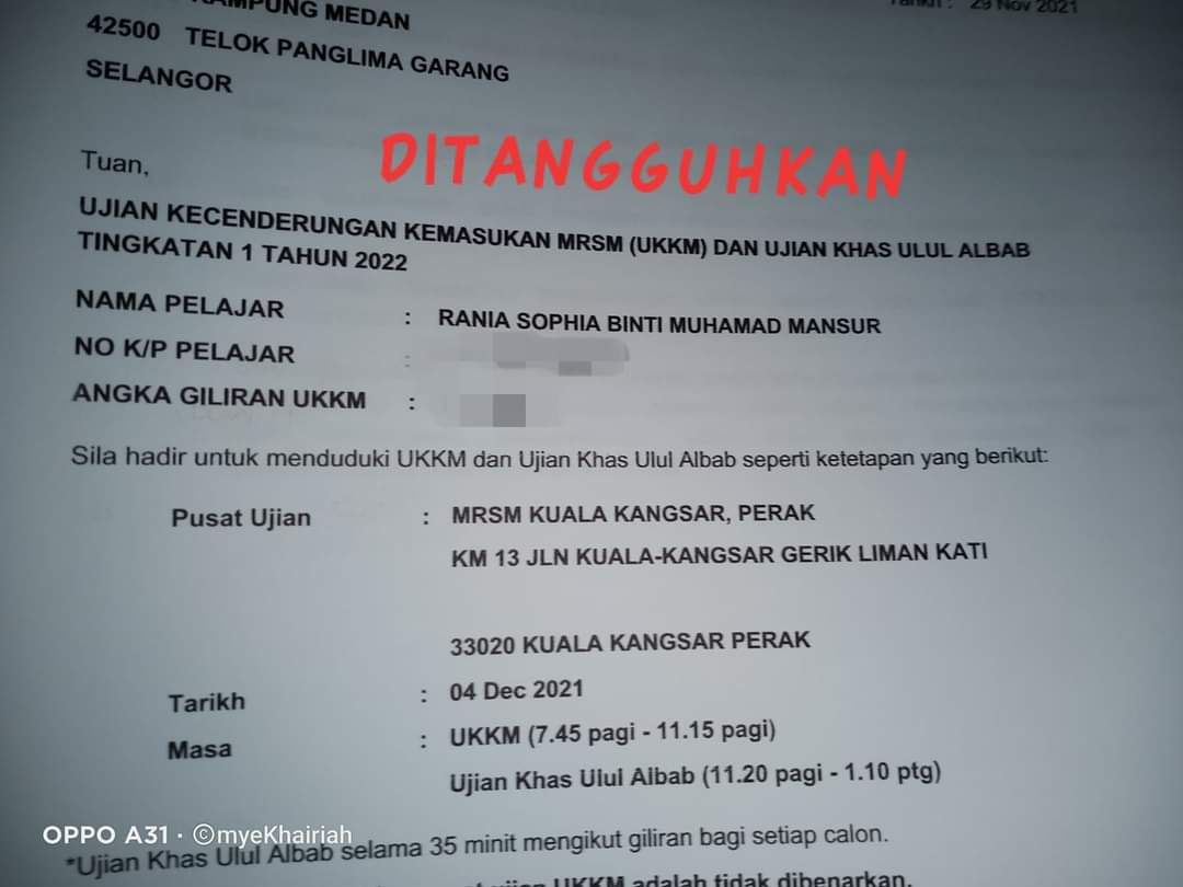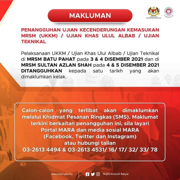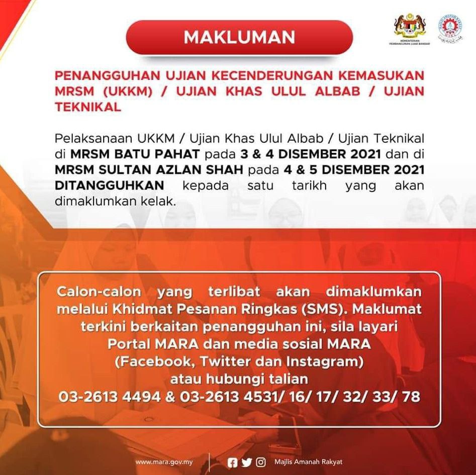 Makluman Panggilan Ujian Kecenderungan Kemasukan MRSM (UKKM) / Ujian Khas Ulul Albab / Ujian Teknikal bagi Tingkatan 1 dan 4 tahun 2022