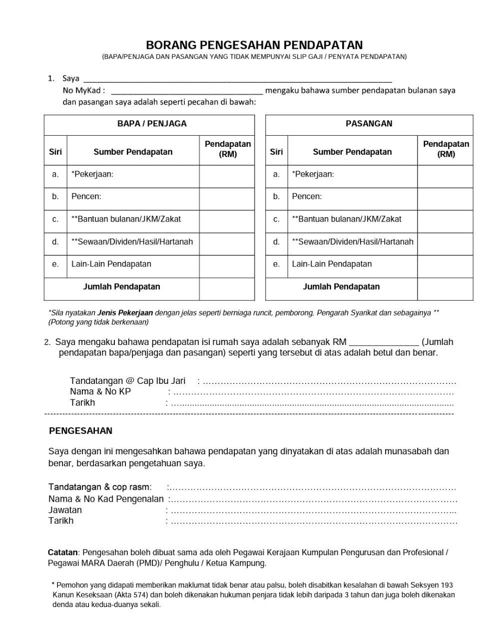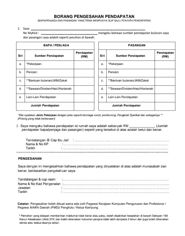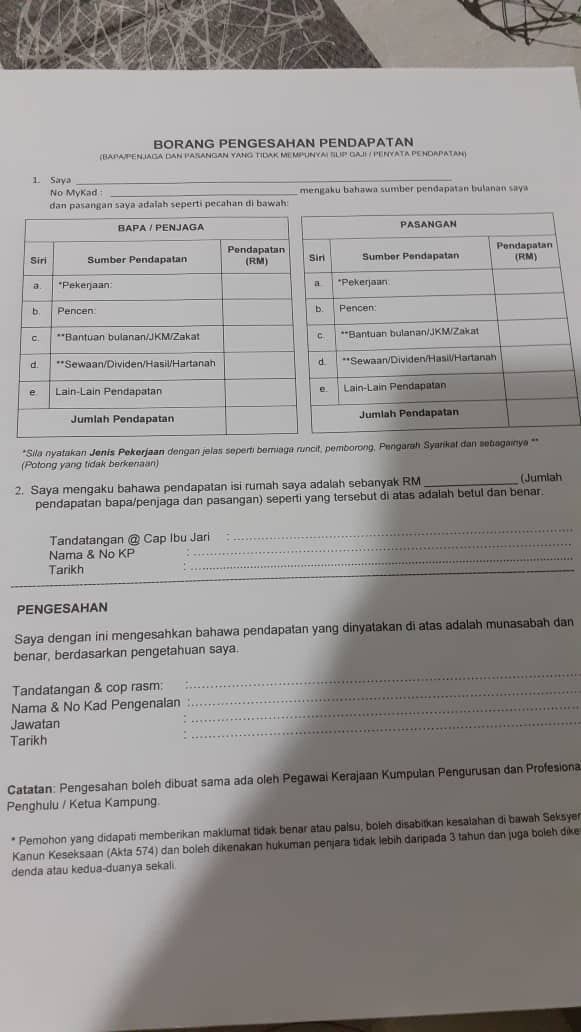 Assalammualaikum..maaf nk tnya macam saya suri rumah tak ada pendapatan...mcm mana nk isi borang ni ye...suami ada slip gaji (kakitangan kerajaan)..ke saya tak perlu isi borang pengesahan ni...nama tu nak tulis nama saya/suami
