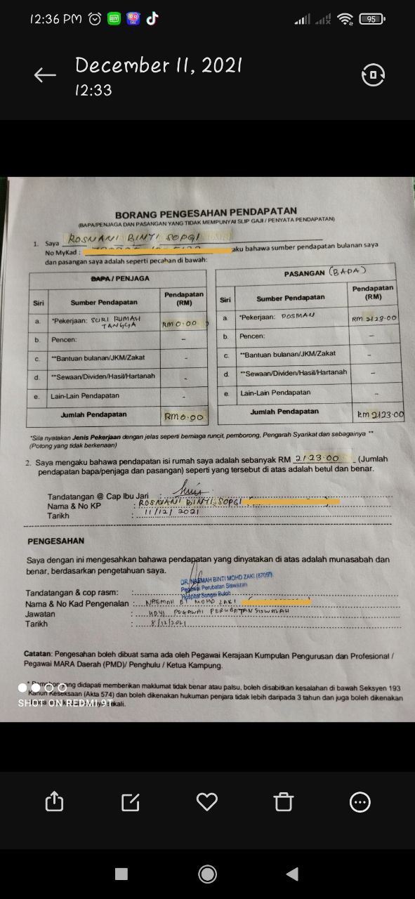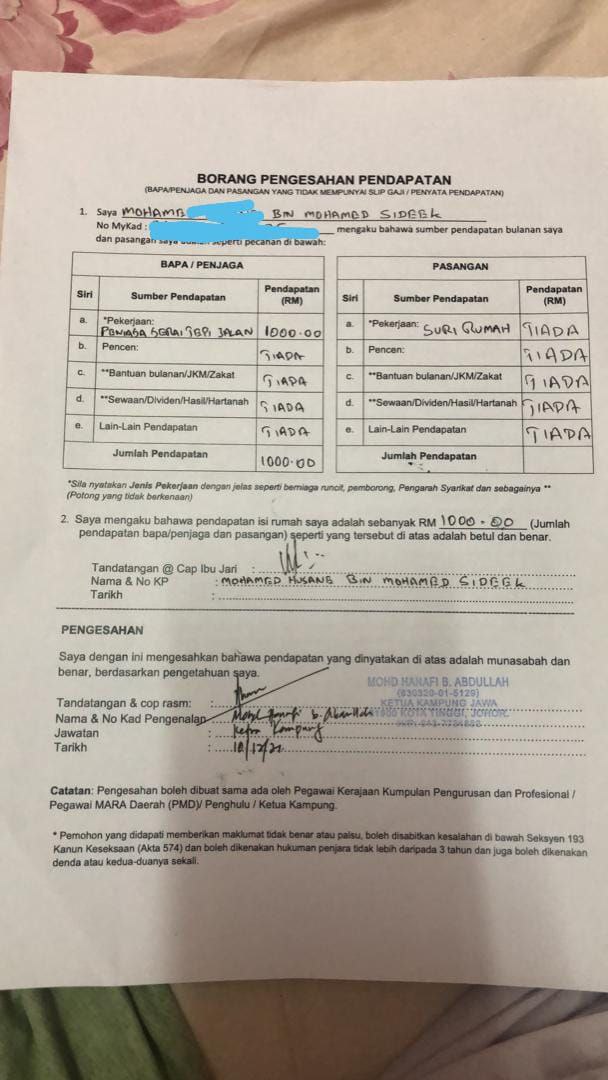 Pendapatan ibu Rm0.00 pun perlu pengesahan yg ianya Rm0.00.