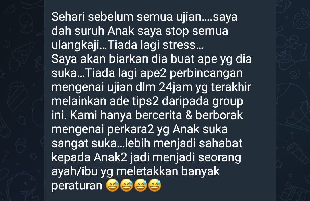2 minggu ni Tuan Hashim boleh berehat memantau parents bercerita pasal soalan. Lepas ni group mungkin akan sunyi ckit dan dijangka akan kembali meriah selepas 15hb Mac nanti🤣🤣
