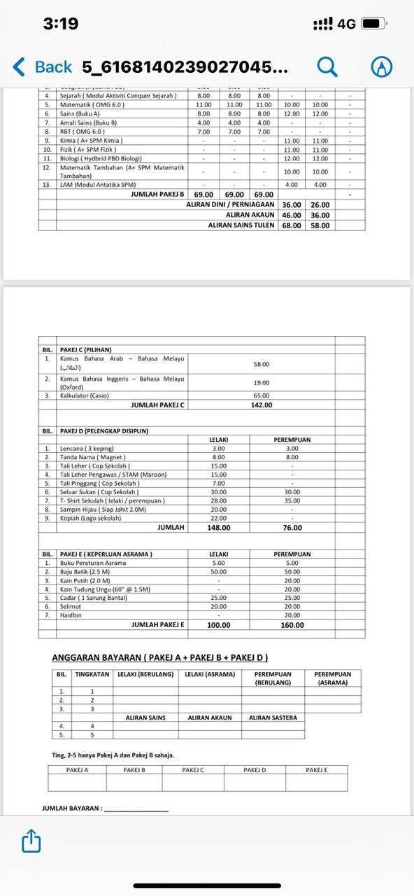 Selain barang di atas... sediakan cash about Rm3-5 ratus sebab... kena bayar macam macam yuran lagi walau dah bayar RM100++ secara on-line. Di maktab nanti baru bayar yuran pelbagai termasuk dobi Rm10x 7 bulan